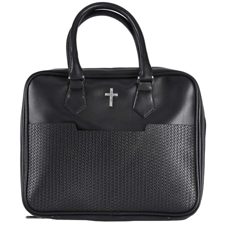 Handbag style black polyurethane Bible cover with open front pocket with basket-weave texture. The front features a cross plate with text: Amazing Grace. Features purse-style handles, a cross zipper pull, elastic pen loop and a ribbon bookmark.