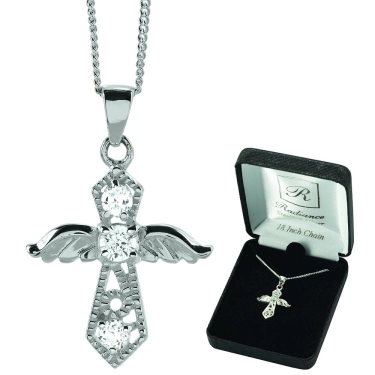 This angelic cross necklace has elegant wing design and three sparkling stones. Pendant is sterling silver and 3/4″” long; chain is also sterling and measures 18″”. A heavenly gift for anyone who loves angels! Deluxe black presentation box included.
