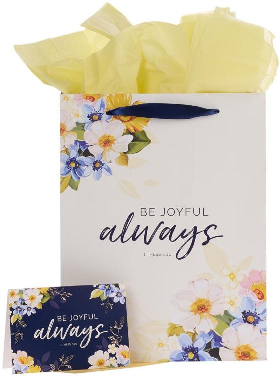 Celebrate a loved one’s special accomplishment when you wrap a gift in the Be Joyful Always Yellow and Navy Blue Floral Portrait Gift Bag Set. Its bright design and happy sentiment will inspire joy before they even open it.