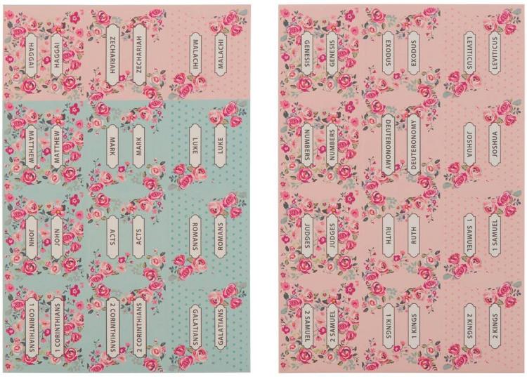 The Bible indexing tabs are decorated in two designs: a pink background with pink florals to identify the books in the Old Testament and a blue background with pink florals to identify the books in the New Testament. Each tab features a white bracket frame with a unique black-lettered Bible name.