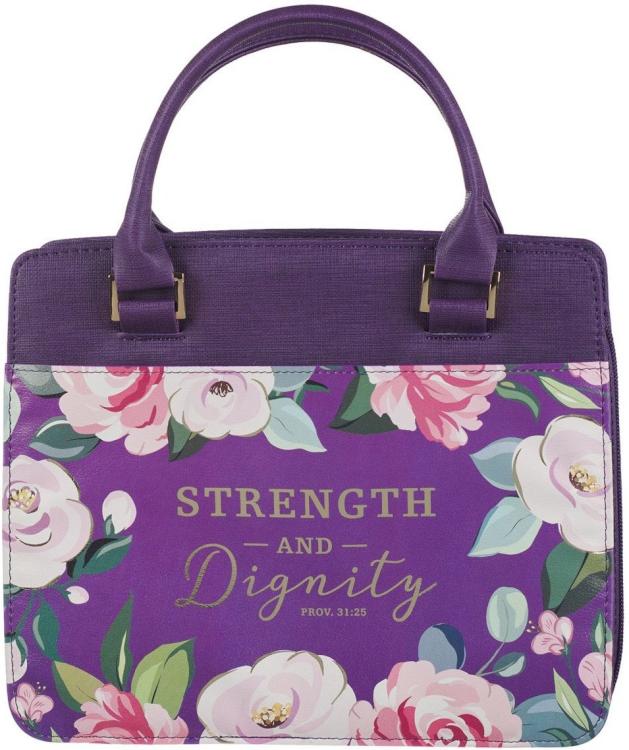 Carry your Bible in the Strength and Dignity Purple Floral Purse-style Bible Cover to protect it in style. The elegant purse-style Bible cover is a convenient way to carry your Bible and ensure its protection from the elements.