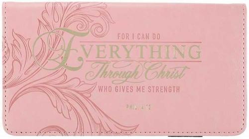 The Through Christ Fluted Iris Pink Faux Leather Checkbook Wallet reminds the busy Christian that when you trust in God, you can be content in times of abundance and in times of need.