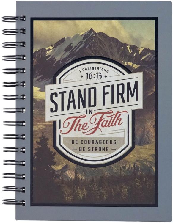 The Stand Firm Mountain View Wirebound Journal is part of the Stand Firm Gray Mountain View Collection, designed to encourage men to stand firm in their faith. This collection includes a ceramic coffee mug, a stainless steel travel tumbler, a keychain, a wirebound journal, and a gift bag.