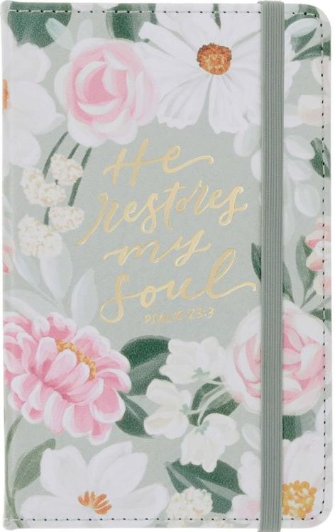 As part of the He Restores My Soul Green Floral Garden Collection, the He Restores My Soul Green Floral Garden Faux Leather Hardcover Notebook with Elastic Band Closure is a wonderful gift for a friend who could use some encouragement from the truth of Scripture and a happy floral design. This collection also features items such as a spiral journal, a stainless steel tumbler, a vase, a candle, a spatula, a Bible cover, a set of prayer cards, a pillbox, a note block and pen combo, a small notebook, a compact KJV Bible, and a die-cut magnet.