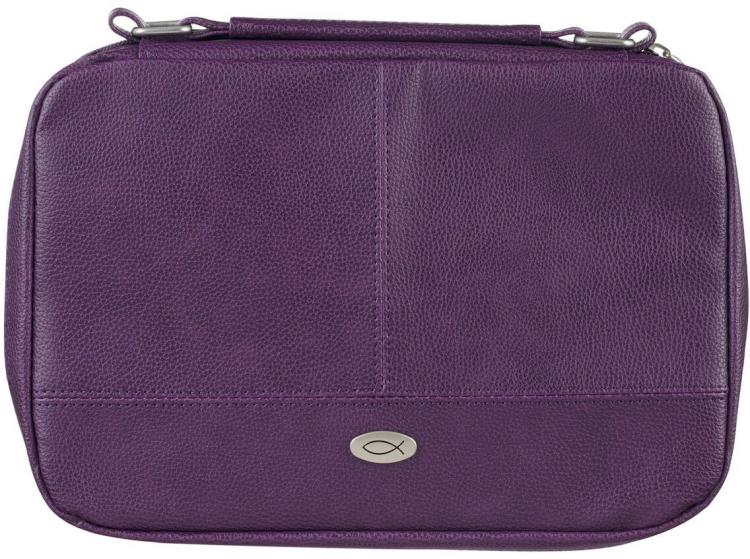 Rich purple faux leather is neatly stitched into three sections on the front panel, where an elegant silver medallion is engraved with an Ichthus emblem a subtle nod to her faith. The case has a coordinating purple lay-flat handle that is attached with silver metal hardware to give it a polished look.