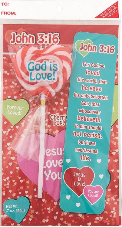 A great addition to religious candy, this lollipop comes designed as a colorful heart with twisted red and white colors. There is also a double-sided bookmark included with a quote from John 3:16 and a word search inside. Give these out during Valentine’s Day, Sunday School or VBS.