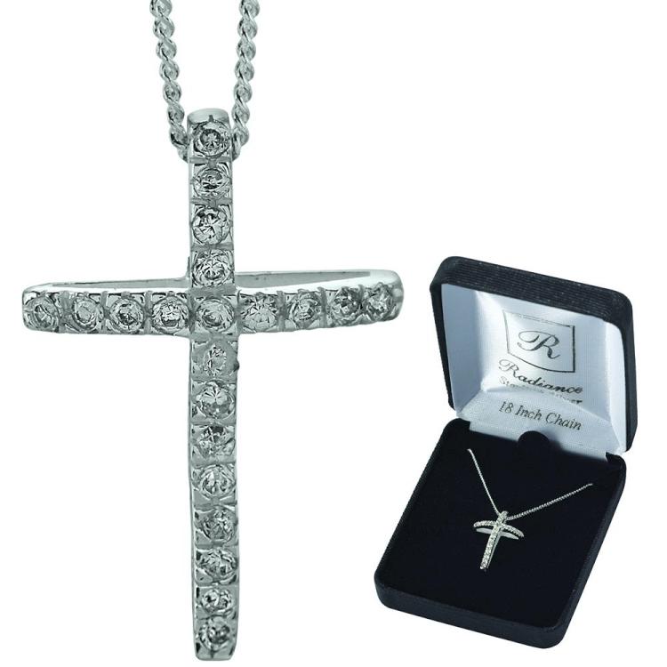 This unique cross curves out like a bow. Set end-to-end with sparkling cubic zirconia stones, it’s an eye-catching, one-of-a-kind design. Sterling silver cross pendant is about 7/8″” long and sterling chain is 18″”. This cross necklace comes in an elegant black presentation gift box.