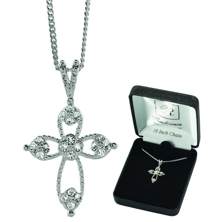 Shimmering sterling silver cross necklace has open petal design with bead texture, and is set with 20 sparkling stones in five floral design clusters of four. Even the lovely v-shape bail repeats the beaded texture for a truly one of a kind look. Bead-tipped cross pendant is just under 3/4″” long, and the sterling cable chain is 18″” long. Deluxe gift box.