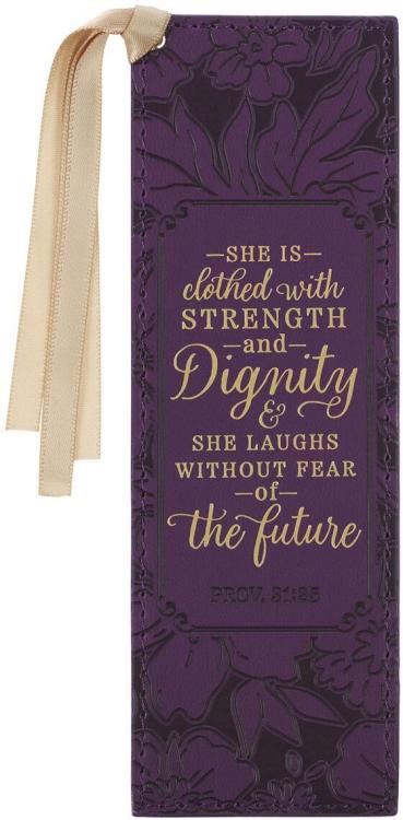 Strength and Dignity Purple Rose Faux Leather Bookmark celebrates a godly woman’s virtues with Proverbs 31:25~ featuring a heat-debossed purple rose design.