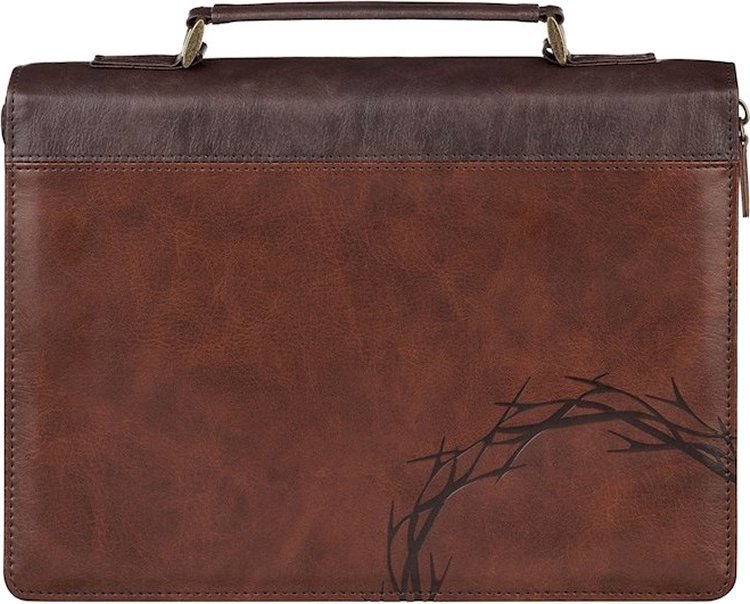 The Bible case has a two-tone brown design with a chestnut brown font cover that is heat-debossed with a crown of thorns in the lower right corner. This panel is connected to espresso-brown faux leather that wraps around the spine and fills the back. Durable topstitching around the edges and the seams ensures a strong connection. The back cover has a slip pocket, where you will find a gold-foiled Scripture verse to support the cover design.