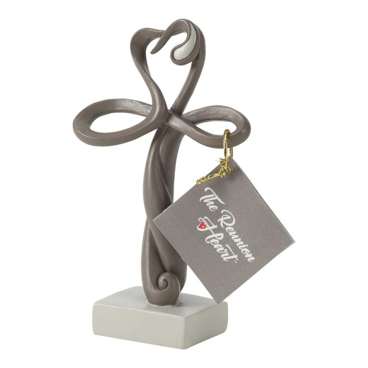 The Reunion Heart Tabletop Cross with Verse Tag This unique loop cross is sculpted to have the Reunion Heart teardrop heart shape at the top. Color is a soft taupe on a lighter taupe base. Attached is a tag with the comforting Reunion Heart poem inside. Overall height of figurine is 6″”; width is 3 5/8″”. Made of resin. Text of poem: Since Heaven has become your home I sometimes feel I’m so alone; and though we now are far apart you hold a big piece of my heart. I never knew how much I’d grieve when it was time for you to leave or just how much my heart would ache from that one fragment you would take. God lets this tender hole remain reminding me we’ll meet again and one day all the pain will cease when He restores this missing piece. He’ll turn to joy my every tear with thoughts of you I hold so dear and they’ll become my special way to treasure our Reunion Day. Verse by Alda Maria copyright Dicksons