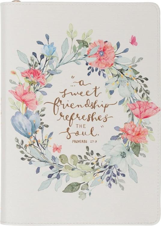 The A Sweet Friendship Bright Floral Wreath Faux Leather Classic Journal with Zipper Closure is a heartfelt way to celebrate the joy of meaningful connection. With its cheery floral design, uplifting Scripture, and secure zipper closure, this beautiful journal is perfect for keeping your thoughts, prayers, and memories safe.